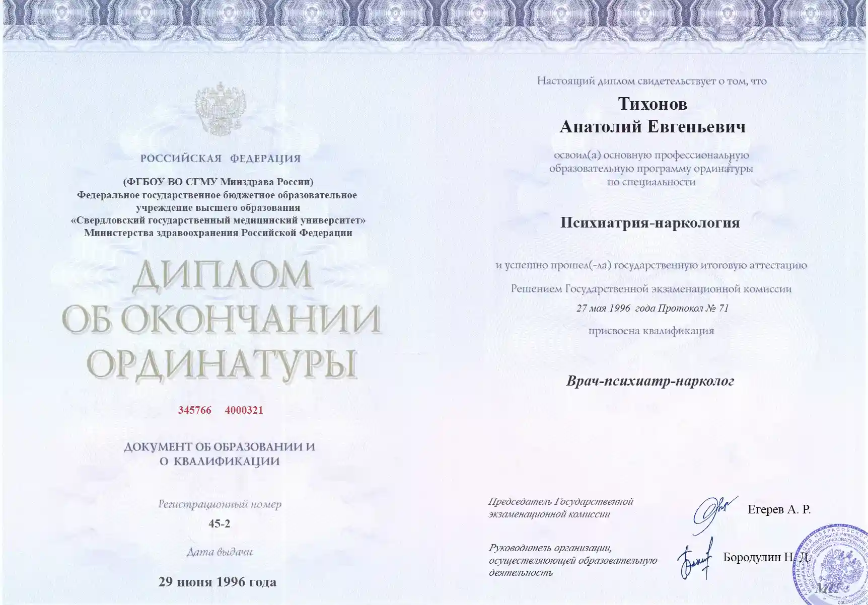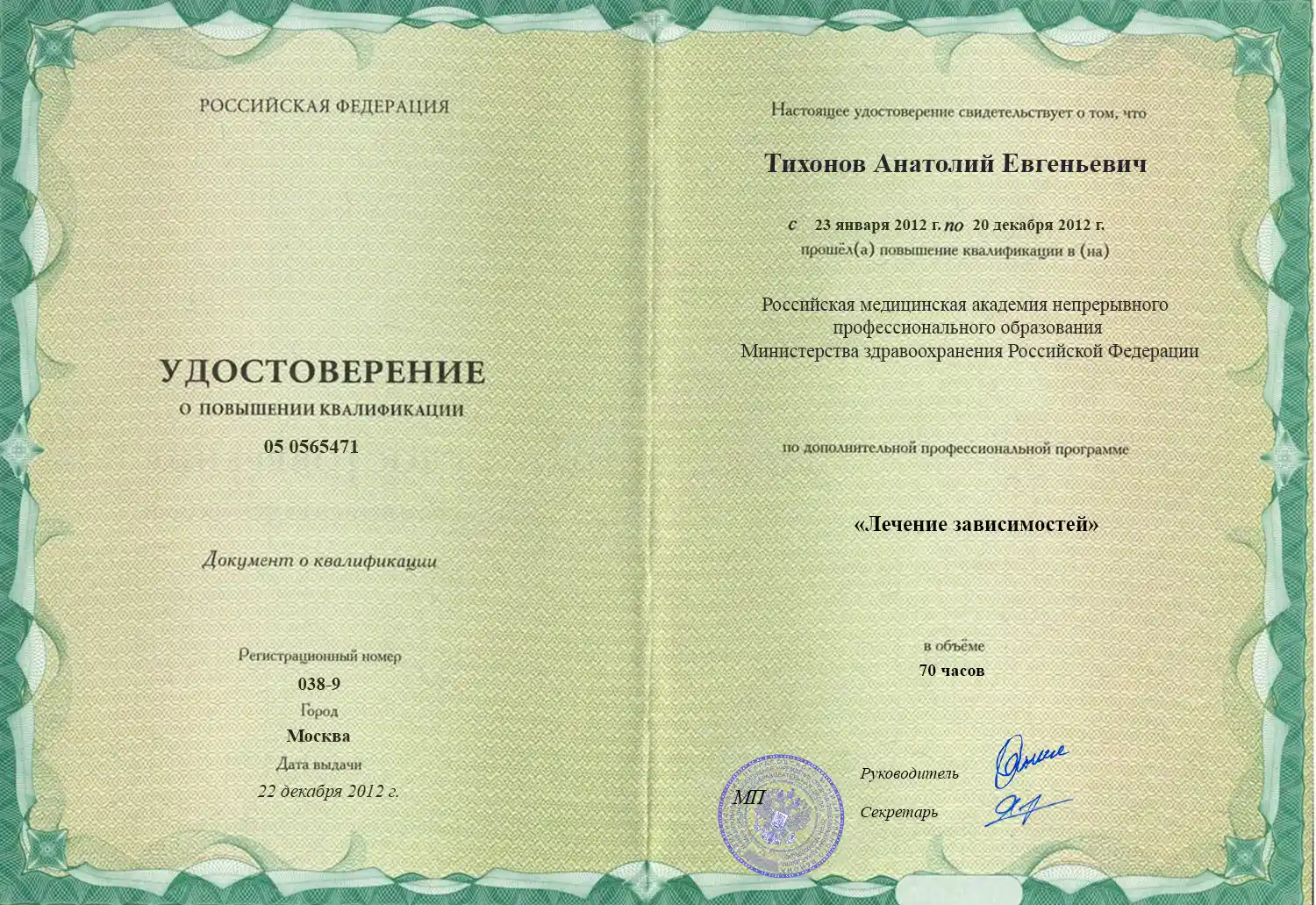 Большое спасибо доктору Анатолию Тихонову за его профессионализм и отличное сопровождение во время моего отказа от наркотиков.